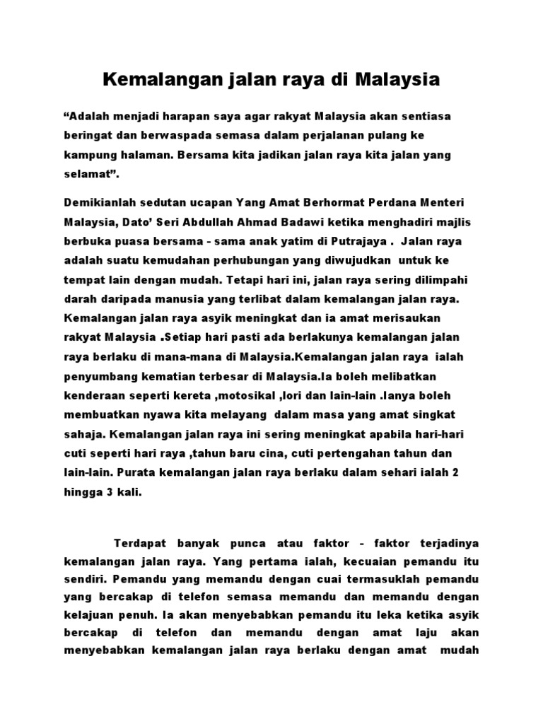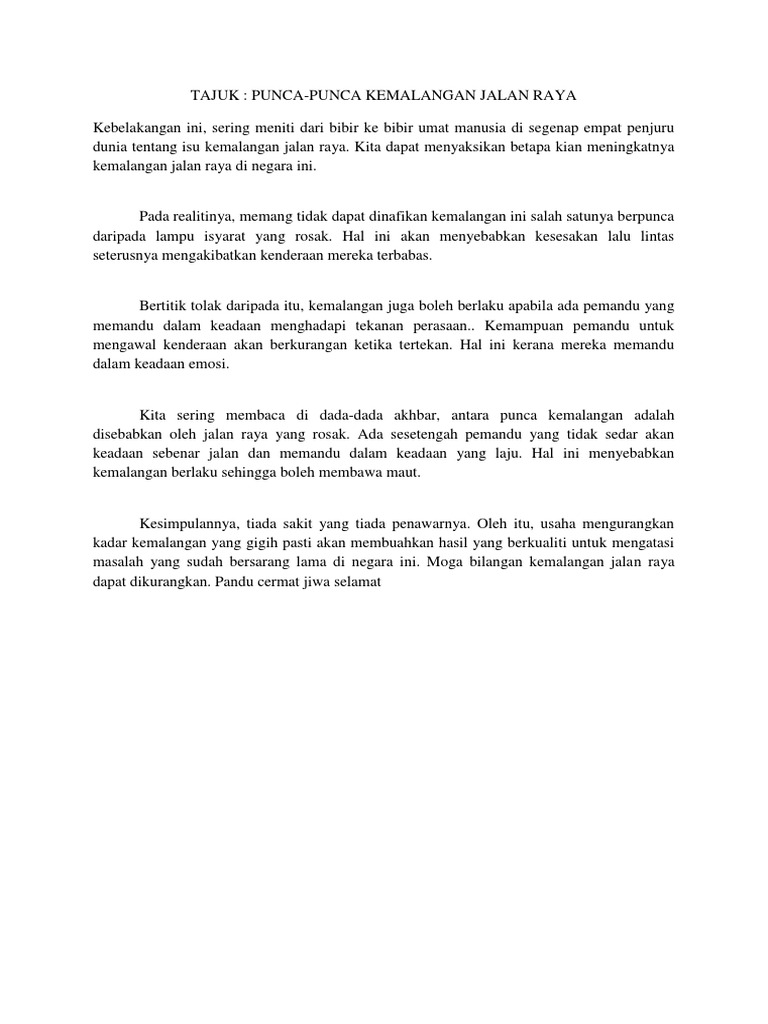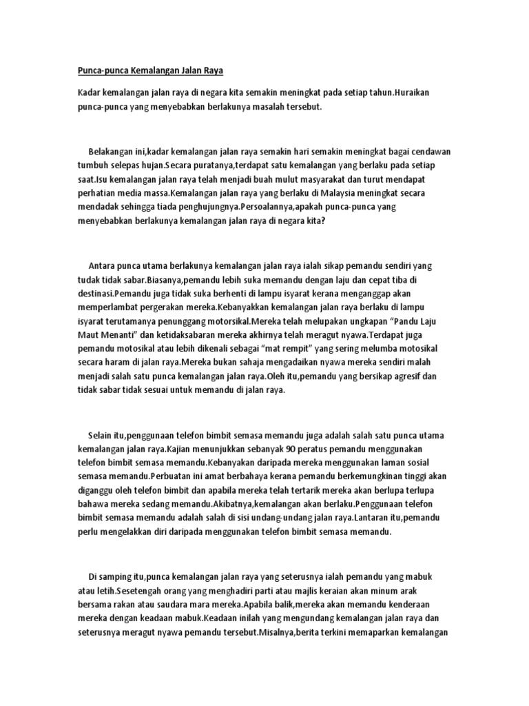 Punca punca kemalangan jalan raya karangan spm. Faktor berlakunya kemalangan jalan raya. Prakarsa utama dalam mendepani isu kemalangan jalan raya adalah dengan memastikan sikap setiap pemandu itu sentiasa berhemah informasi berkaitan. Kadar kemalangan jalan raya begitu meningkat setiap tahun. Kemalangan jalan raya ialah peristiwa ngeri yang biasanya melibatkan perlanggaran dua kenderaan atau lebih di jalan raya atau pun lebuh raya.
