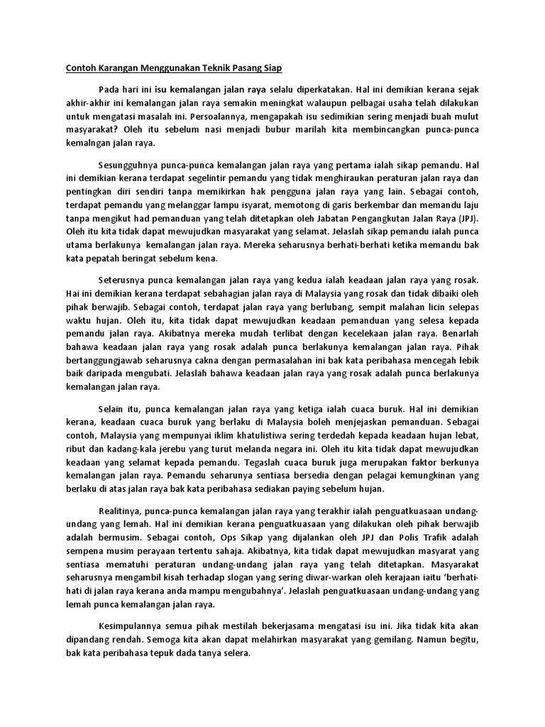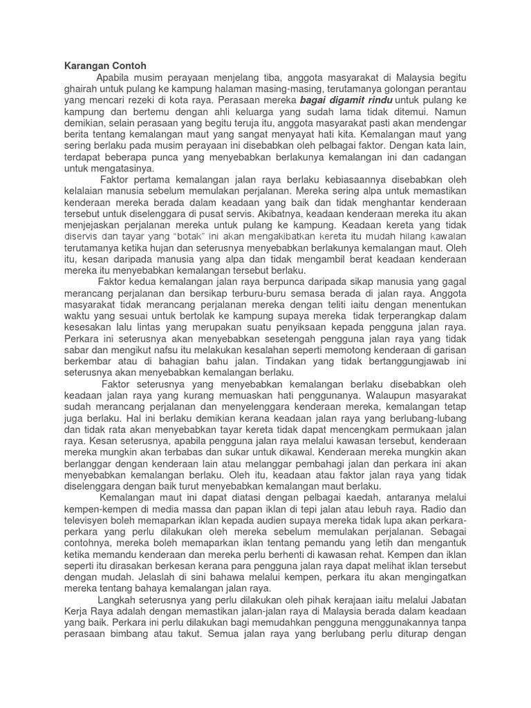 Pukul 5 pagi aku sudah bangun untuk. Adalah menjadi harapan saya agar rakyat malaysia akan sentiasa beringat dan berwaspada semasa dalam perjalanan pulang ke kampung halaman. Kemalangan jalan raya kemalangan jalan raya yang berlaku di negara ini meningkat daris e m a s a k e semasa. Tamsilnya, terdapat pemandu yang memandu kenderaan sambil menggunakan telefon bimbit. Demikianlah sedutan ucapan yang amat berhormat. Hari minggu ini adalah hari yang paling melelahkan bagiku. Panjang huraian tersebut hendaklah antara 200 hingga 250 patah perkataan. Tapi sebelum menuju contoh karangan yang dimaksud. Sebagai contohnya, majoriti pemandu masih menggunakan telefon bimbit ketika memandu di mana secara tidak langsung menjadi punca mereka kehilangan fokus dan. 14 contoh karangan narasi tentang pendidikan, liburan, lingkungan, guru, sekolah juga pengalaman untuk pembahasan kali ini kami akan memberikan ulasan mengenai contoh karangan narasi yang dimana dalam hal ini meliputi contoh tentang pendidikan, liburan, lingkungan, guru. Faktor berlakunya kemalangan jalan raya. Jalan raya yang kurang baik membuatkan pemandu kenderaan terpaksa memberikan sepenuh perhatian apabila melalui jalan tersebut. Pengalaman menyaksikan kemalangan jalan raya 1430wpdrzg4j.